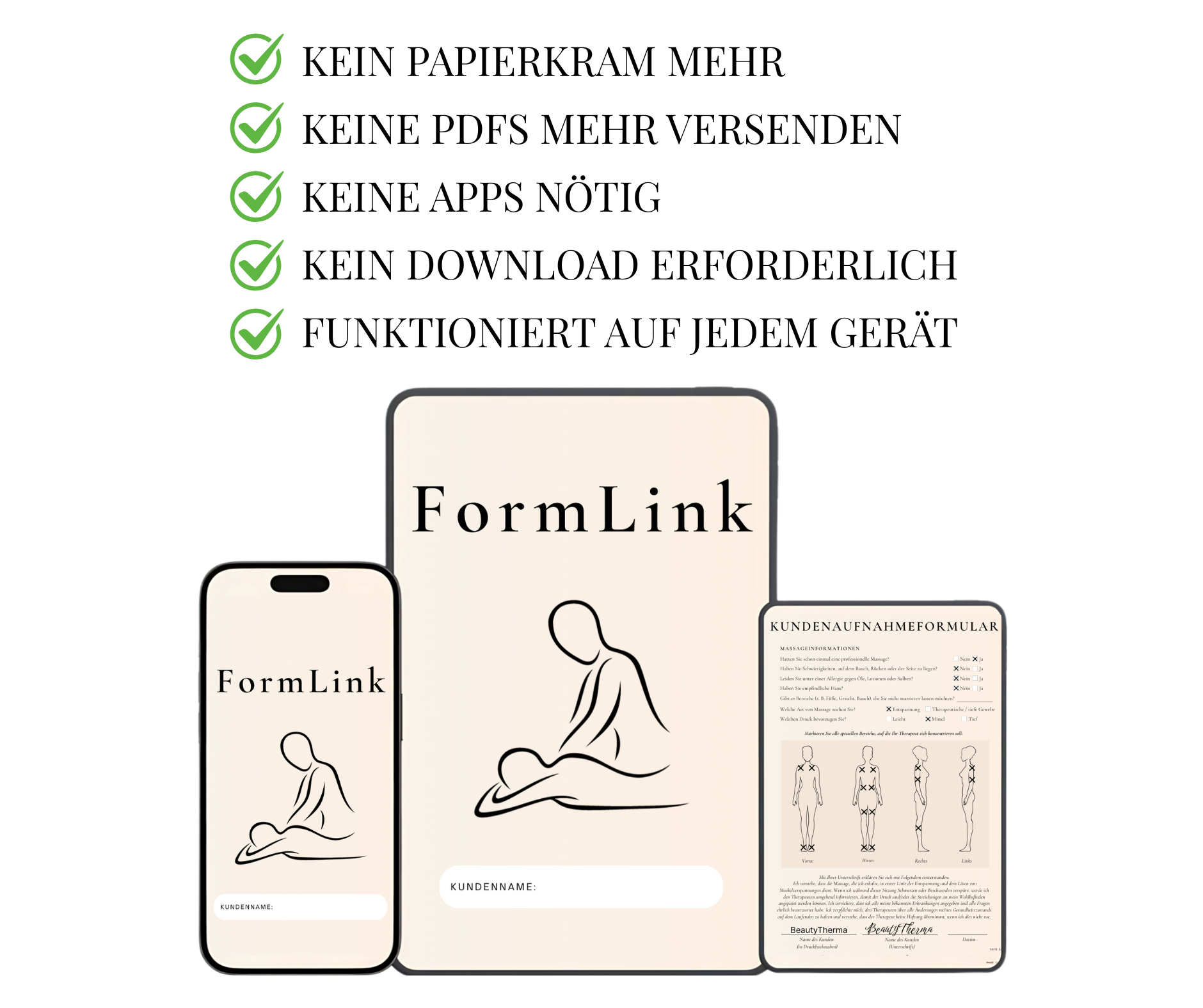 FormLink vorgestellt: Hebe dein Serviceangebot auf ein neues Level mit FormLink – der digitalen Lösung, die deine Kundenformulare revolutioniert. Entwickelt für Beauty- und Wellness-Profis, vereinfacht unser Service das Ausfüllen von Formularen, damit du dich mehr auf deine Kund:innen und weniger auf den Papierkram konzentrieren kannst.