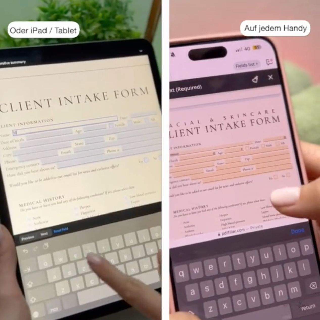 Formulare überall ausfüllen: Deine Kund\:innen können die Formulare auf dem Handy oder Tablet ausfüllen – egal ob zu Hause oder in deinem Wartebereich.